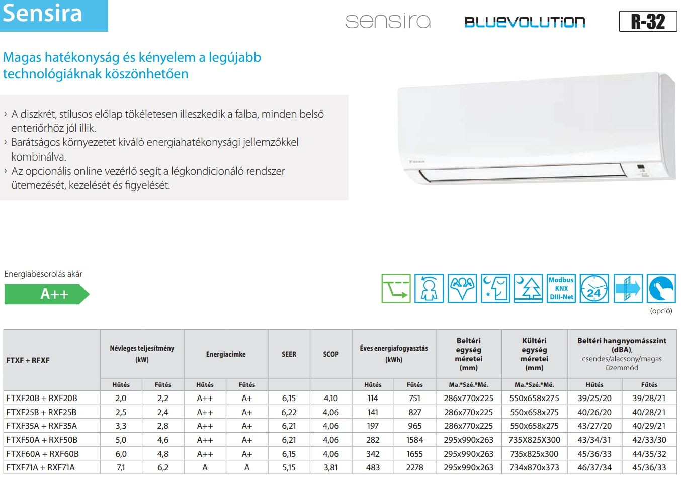 A Daikin FTXF50F / RXF50F Sensira Inverteres Split klíma fontos tulajdonságai: