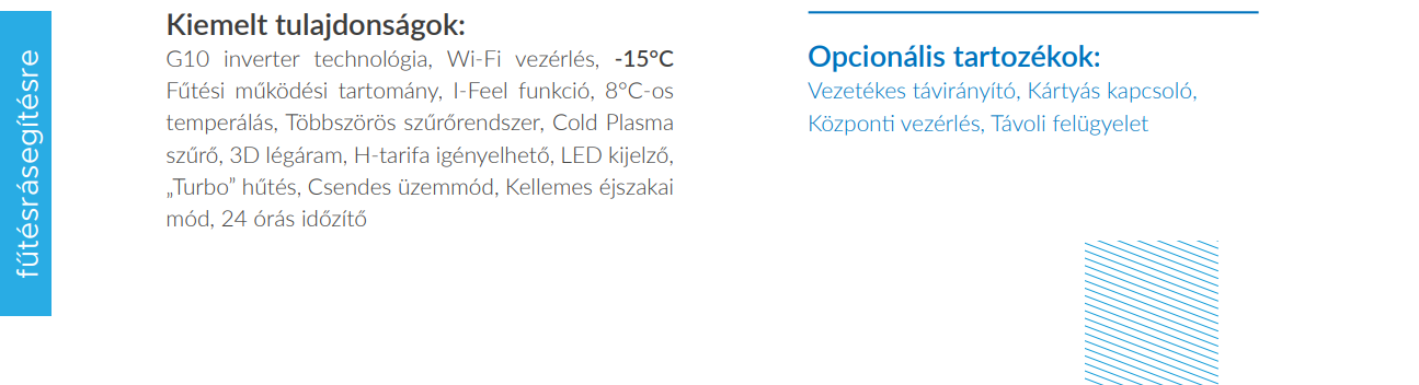 Felszerelés és beüzemelés díja bruttó 55.000 Ft, mely tartalmazza a kiszállást, a készülék helyszínre szállítását, a kültéri és beltéri egység felszerelését, elektromos betáp kiépítését aljzatba max. 5 méterig*, a kültéri tartókonzolt, rögzítő elemeket, a vákuumozást, a berendezés beüzemelését és azzal kapcsolatos dokumentumok kitöltését (pl.: beüzemelési jegyzőkönyv, garanciajegy...), valamint a takarítást.